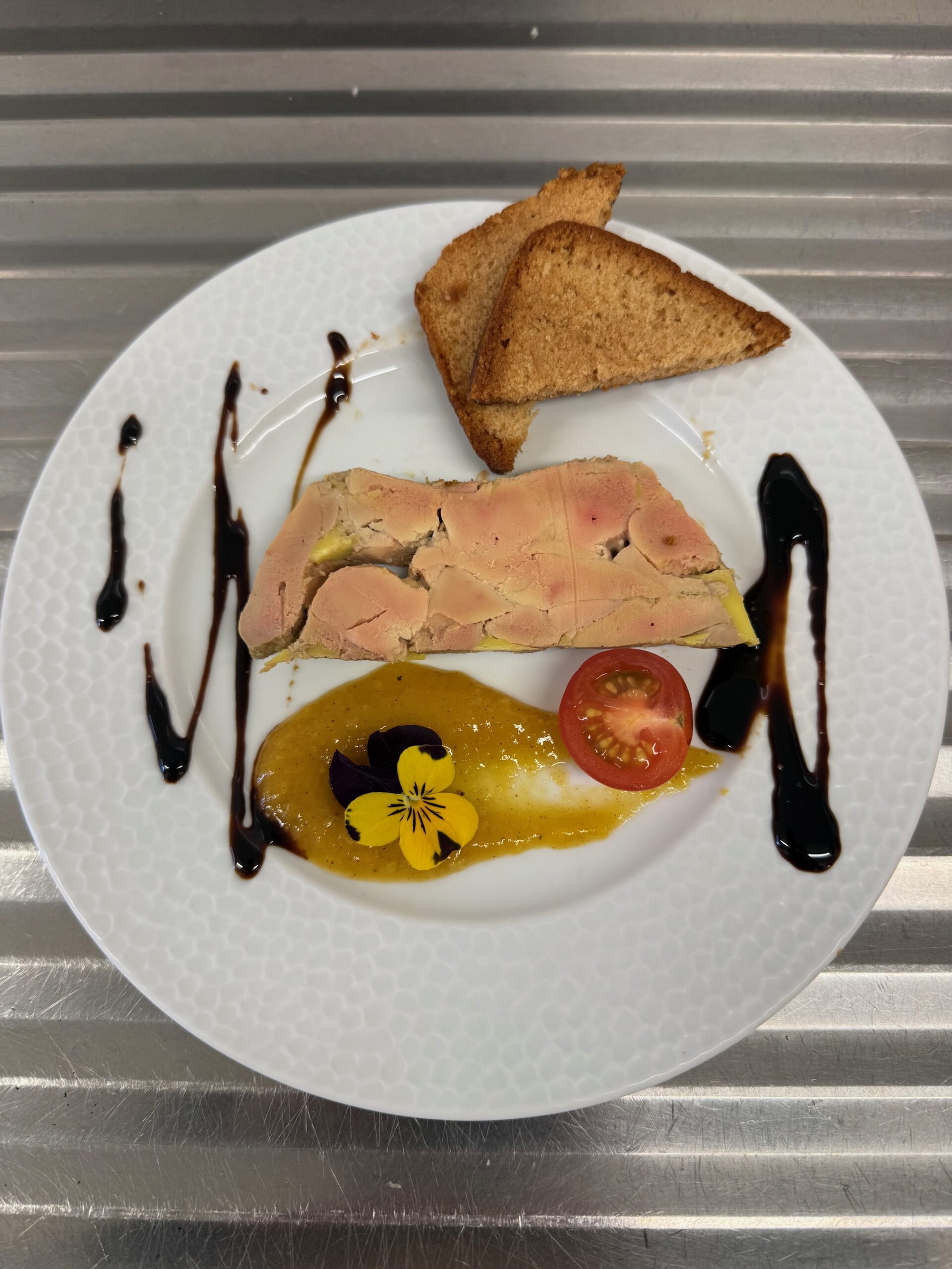Foie gras (origine France) de canard « maison », accompagné de chutney de mangue et de pain d’épices bio « maison »
