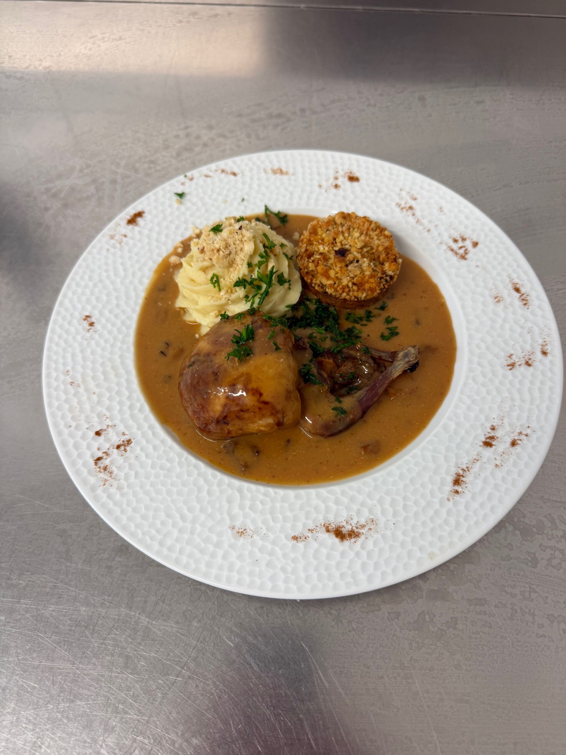 Caille farcie (origine France), sauce aux morilles, purée de céleri locale aux éclats de noisettes et crumble de butternut